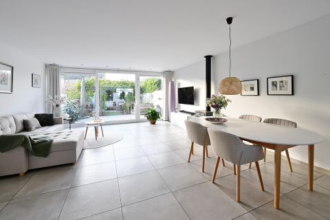 Entree, hal met meterkast, trap naar 1e etage, toilet met fonteintje en toegang tot de sfeervolle woonkamer met houtkachel en de luxe, lichte woonkeuken met airco en openslaande deuren naar de verzorgde zijtuin.